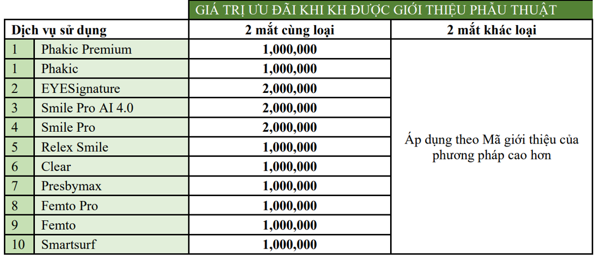 Người giới thiệu và người được giới thiệu sẽ được nhận giá trị ưu đãi với giá trị theo bảng dưới đây. Giá trị thay đổi theo loại dịch vụ phẫu thuật khúc xạ mà Người được giới thiệu sử dụng: