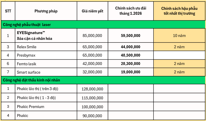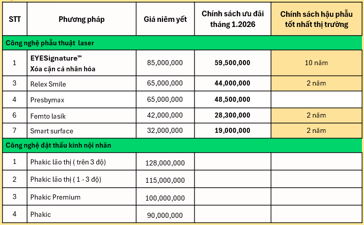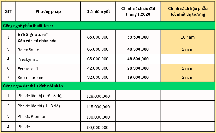 - Hạn mức đặt cọc: là 3.000.000vnd áp dụng với tất cả các phương pháp (trừ phương pháp Phakic) và mức giá tại thời điểm đặt cọc sẽ được bảo lưu đến ngày 28/02/2026 kể từ ngày đặt cọc.
